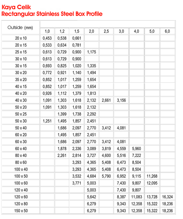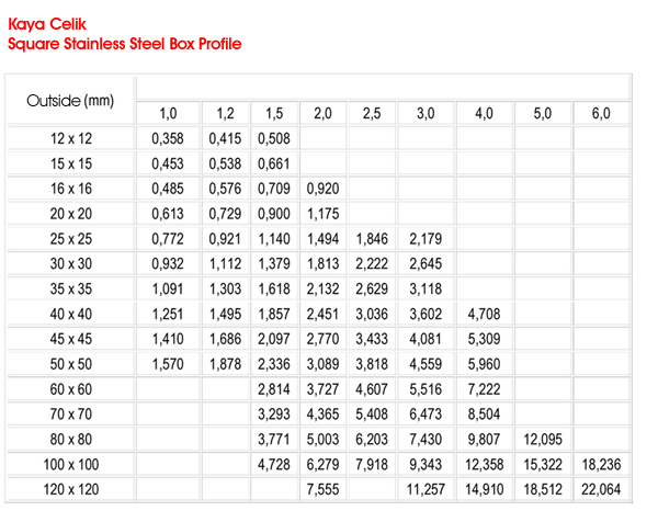 Stainless Steel Profile Stainless Steel Profile Available Sizes 10x10 from 100x100 up to various sizes, 1mm from constantly available in various thicknesses up to 5mm thickness. Profiles of 304 grade stainless equal length and 6 meters. You respected our customers to be able to manufacture more cheaply without compromising quality, followed closely by continuous technology we have as an aim to increase customer satisfaction to the fore.