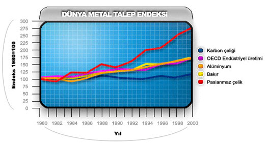 | | Paslanmaz Çelik Paslanmaz çelikler, bileşimlerinde en az %11 krom içeren bir çelik ailesidir. Bu çeliklerin yüksek korozyon dayanımını sağlayan asıl unsur; yüzeye kuvvetle tutunmuş, yoğun, sünek, çok ince ve saydam bir oksit tabakasının varlığıdır. Çok ince olan bu amorf tabaka sayesinde paslanmaz çelikler, kimyasal reaksiyonlarda pasif davranarak korozyona karşı dayanım kazanırlar. Söz konusu oksit tabakası, oksijen bulunan ortamlarda oluşur ve dış etkilerle (kesme, aşınma, talaşlı imalat, vb.) bozulsa dahi kendini onararak eski özelliğine tekrar kavuşur. Genel olarak paslanmaz çelikler beş ana grupta toplanmaktadır : - Ferritik, - Martenzitik, - Ostenitik, - Ferritik-Ostenitik (Dubleks), - Çökeltme sertleşmesi uygulanabilen alaşımlar. Bu grupların en yaygın olarak kullanılanları şüphesiz ostenitik ve ferritik paslanmaz çeliklerdir. Ferritik paslanmaz çelikler düşük karbonlu olup %12-18 krom içerirken ostenitik paslanmaz çelikler temel olarak %18 krom ve %8 nikel içerirler. Ferritik paslanmaz çelikler alaşımında nikel içermediğinden mıknatıslanabilir. Toplam paslanmaz çelik üretiminin kompozisyonu incelendiğinde, ostenitik paslanmaz çeliklerin üretimde %70 ile en çok kullanılan paslanmaz çelik olduğu görülmektedir. Aşağıdaki grafikte de görüleceği gibi paslanmaz çeliklere olan talep, özellikle son 20 yılda diğer malzemelere göre daha fazla gelişme göstermiştir.  ? Paslanmaz Çelik Özellikleri ? Paslanmaz Çelik Uygulamaları | |