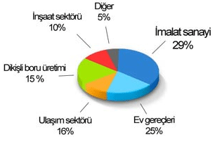 Aşağıdaki grafikte, 2002 yılında dünya paslanmaz çelik tüketiminin sektör bazında oransal dağılımı yer almaktadır.